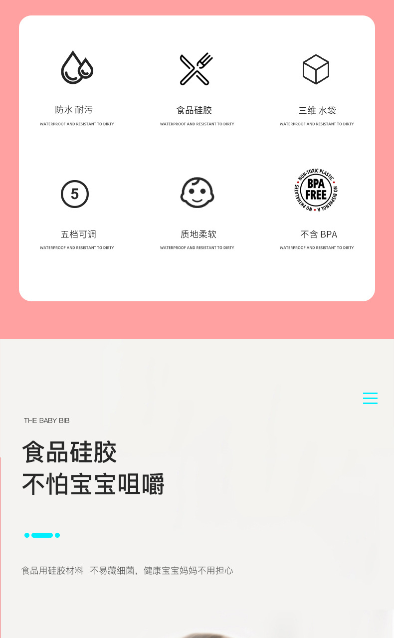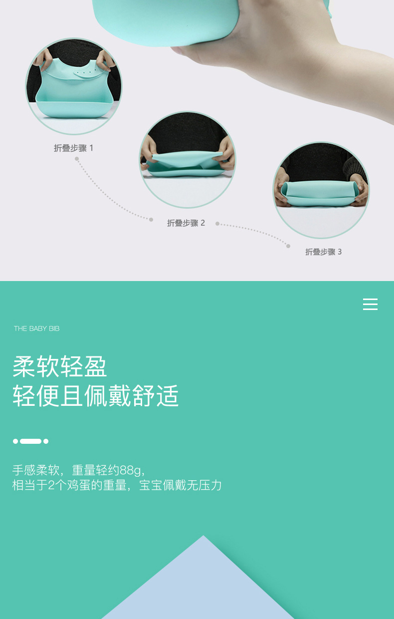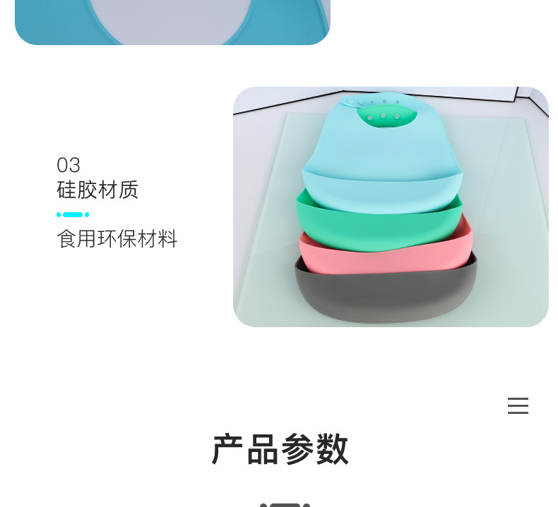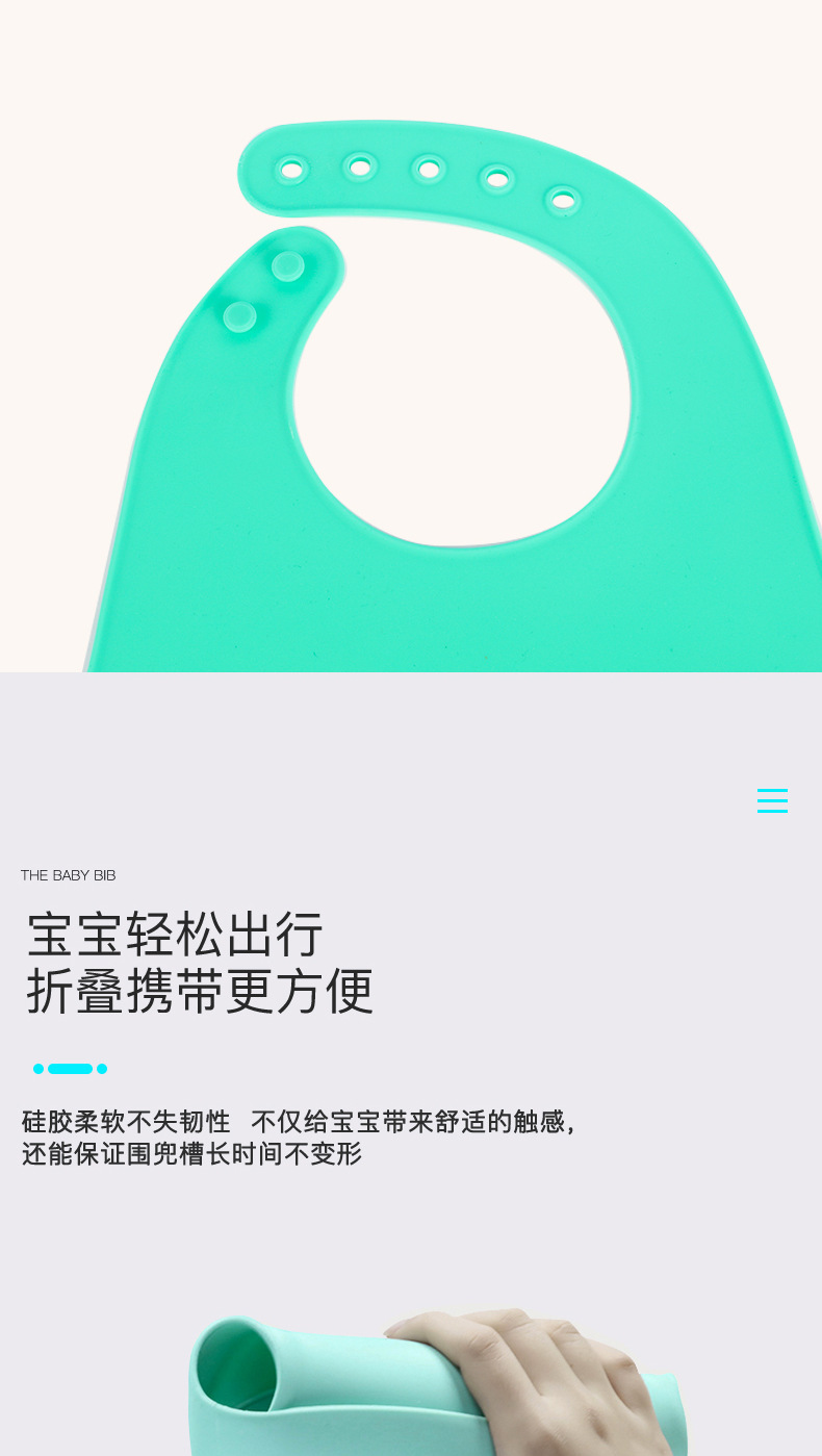 科泰利所生產(chǎn)的硅膠圍嘴兜,選用食品級(jí)環(huán)保原材料制作,材質(zhì)可以信賴,它由科泰利硅膠制品廠家經(jīng)過(guò)200多度高溫加工成型,耐溫防水防油,清潔方便,水沖即可,可以反復(fù)使用。而且硅膠圍兜現(xiàn)在普遍采用3D立體設(shè)計(jì),凹槽可以輕松兜住食物,這樣的設(shè)計(jì)就是在存放的時(shí)候比棉質(zhì)占空間。此外硅膠除了作為圍嘴兜也一樣可以做其他嬰童硅膠制品。
